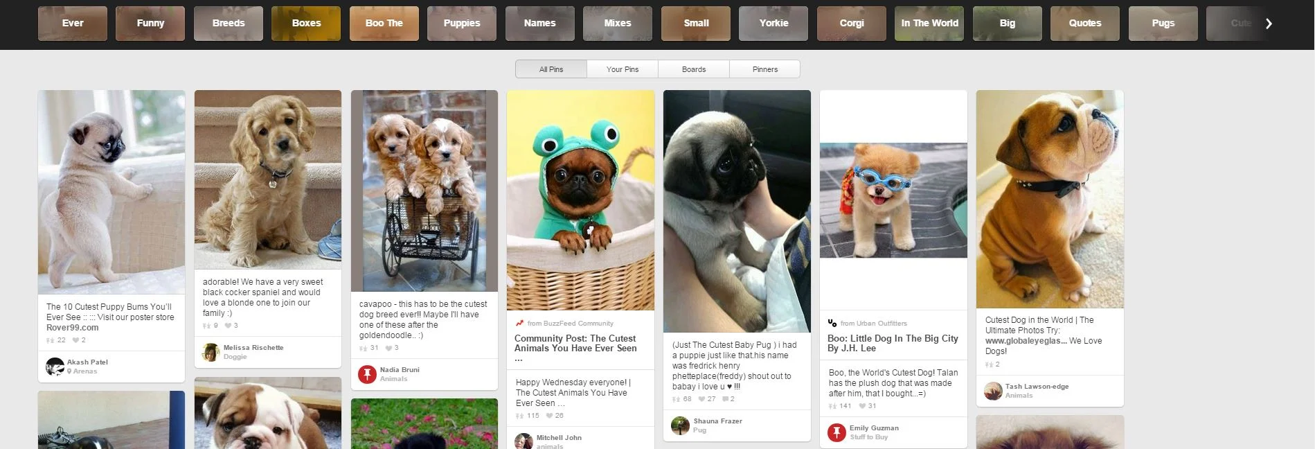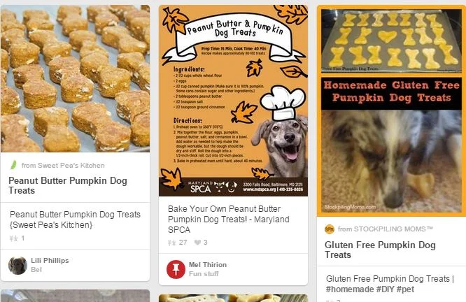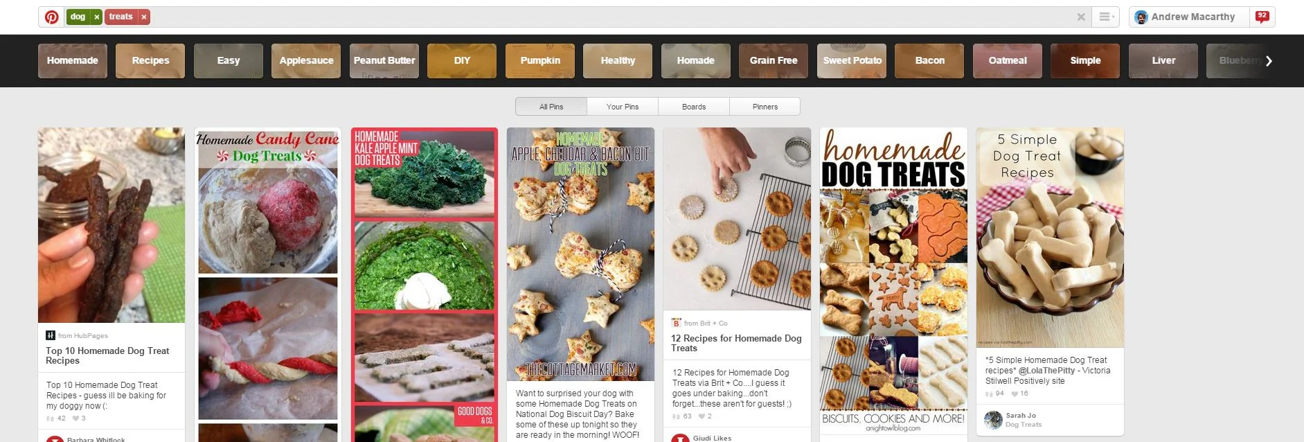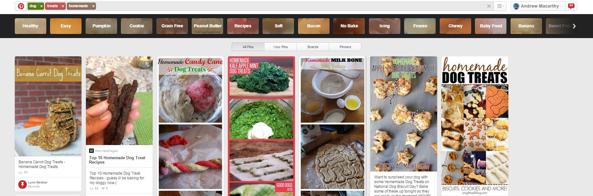 Above, I searched "dog treats", then clicked on the "home made" string to find even more suggestions. Which home made dog treats are currently popular with Pinterest users? Is there a gap in the market I can exploit?