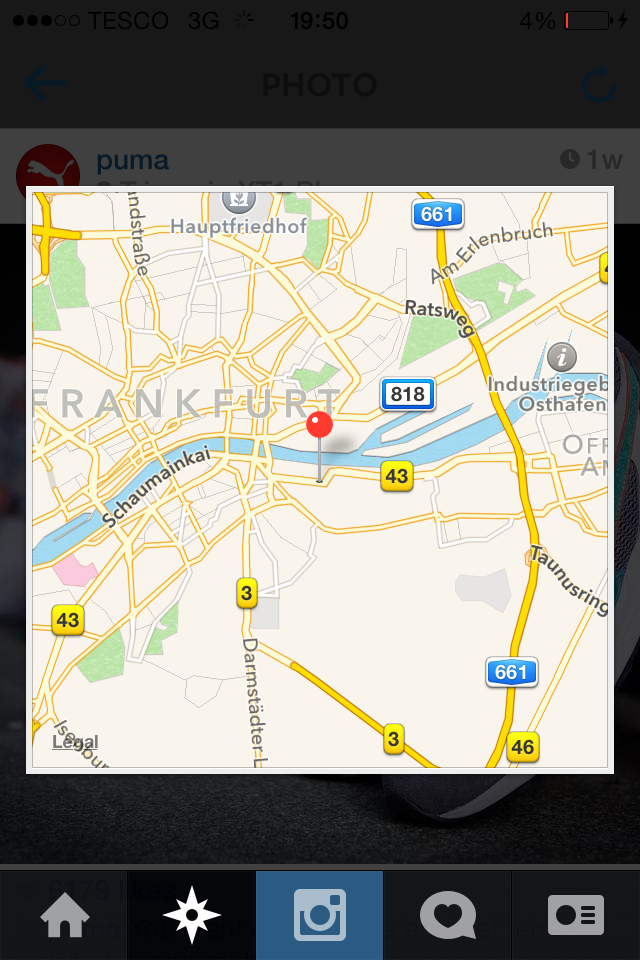 Of course, when you click on the geo-tagged "location" in the above example, all you get is a random place chosen by Puma - Frankfurt in Germany, in this case.
