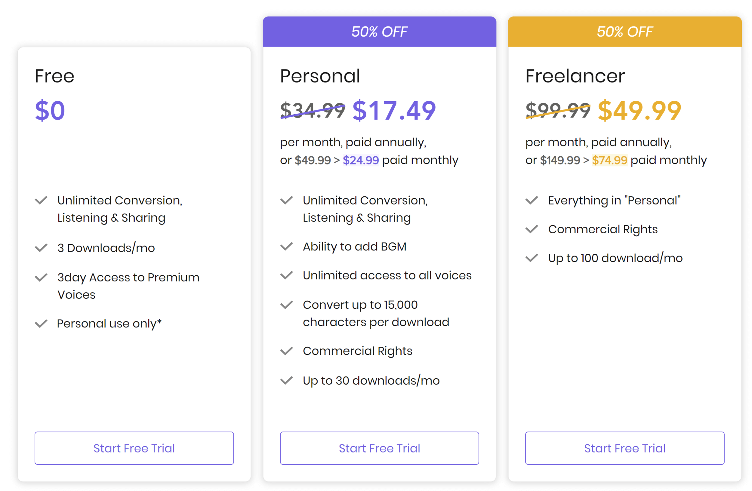 The Personal plan costs $14.25 / month (great for learning, proof-reading, school projects, etc.). For that, you get 240,000 words, standard Voices, unlimited previews, and unlimited downloads.