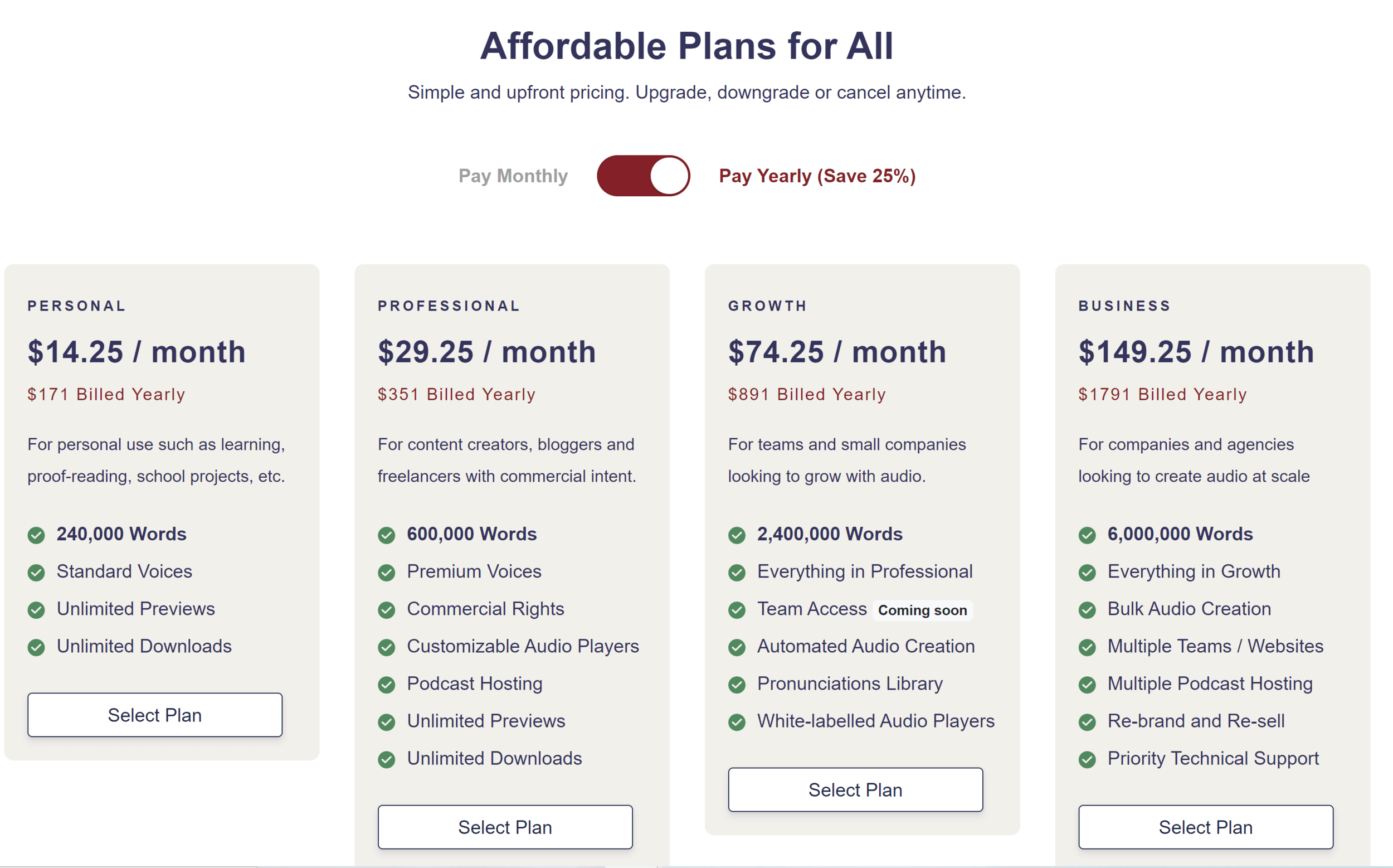 Play.ht has four paid plans, costing from $14.25 per month for individual users up to $149.25 per month for business. These prices are for the yearly plan, on which you save 25% over paying monthly.