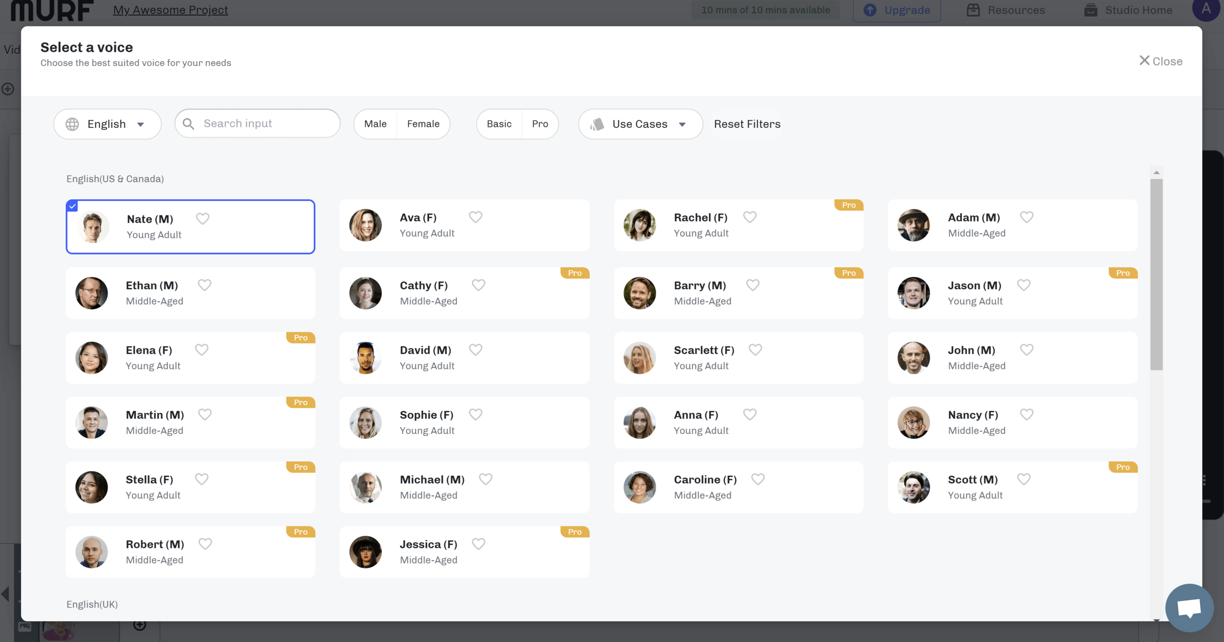 Murf.ai's tagline promises to let you "Make studio-quality voice overs in minutes" for podcasts, videos, and all your professional presentations.