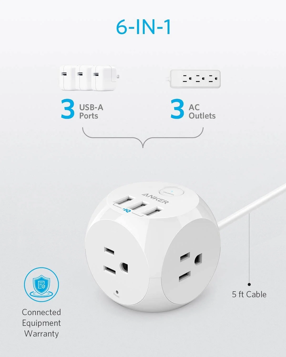 The Anker Power Strip 31 USB-C 3 Cube is a compact and portable power strip that can charge up to 6 devices at once.