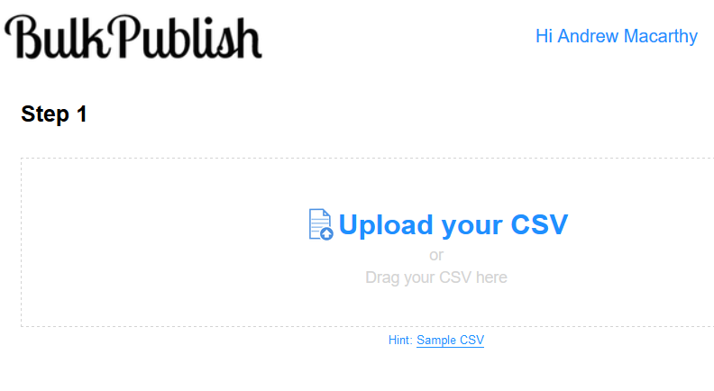 Back at BulkPubilsh, click to upload your CSV or drag the file into your browser. If the .CSV upload fails, try saving your file in a Text (Tab delimited) (*.txt) format instead, then retry.