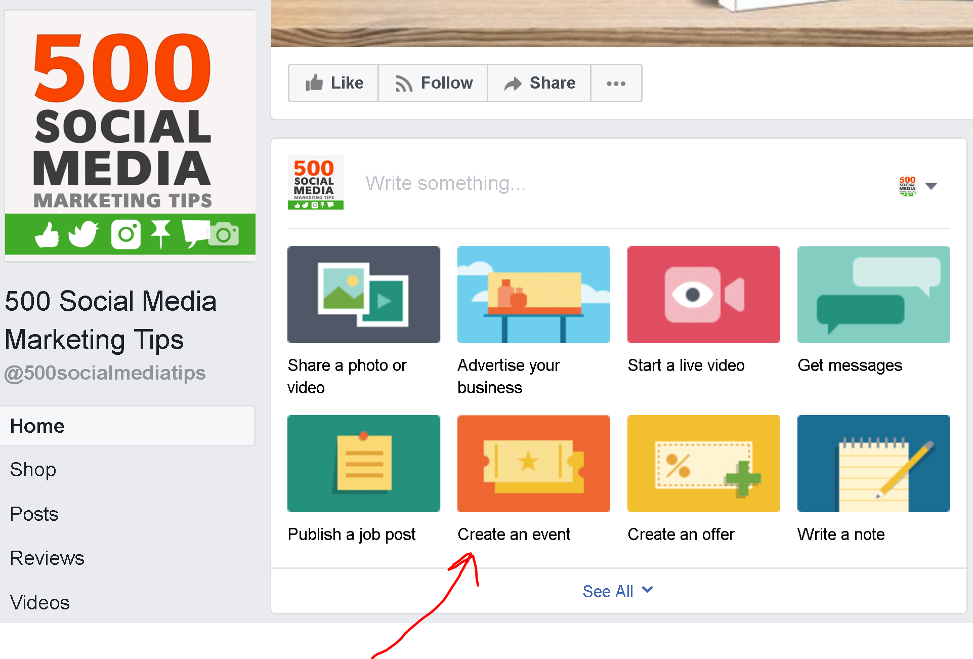 Alternatively, you can click the three little dots next to the Share button at the top of your Page and choose Create Event from the drop-down menu. On mobile, tap the "Event" icon at the top of your Page. Same result either way!