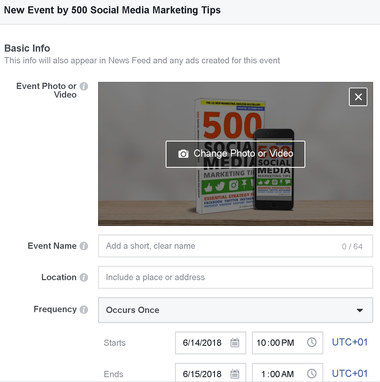 The first step is your Event photo or video. The optimum image size for Event cover photos is 1200 x 628 pixels, while videos can run anywhere from between 30 seconds and 5 minutes long.