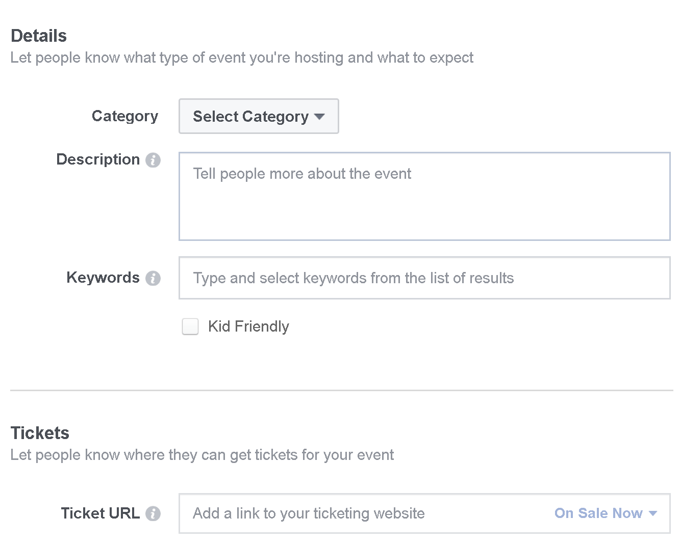 If you're selling tickets to your event, add your ticketing website link to the Ticket URL field. This makes it easy for people to buy tickets and unlocks the ability to create ads that can help drive ticket sales.