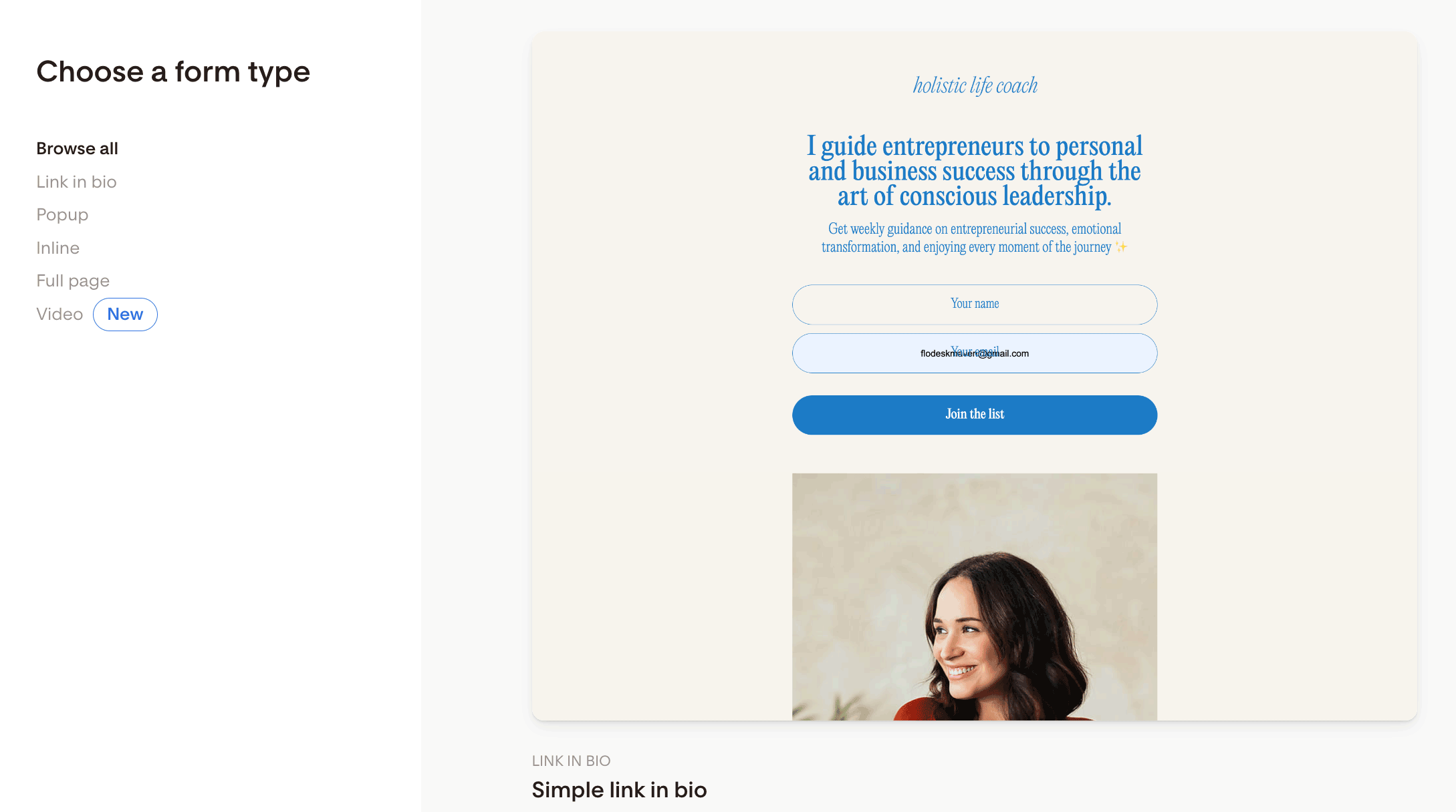 Link in Bio forms are perfect to help you grow your email list directly from social media. You can create a "Link in Bio" page with Flodesk that leads followers straight to your sign-up form and other shareable links - no third party tool required.