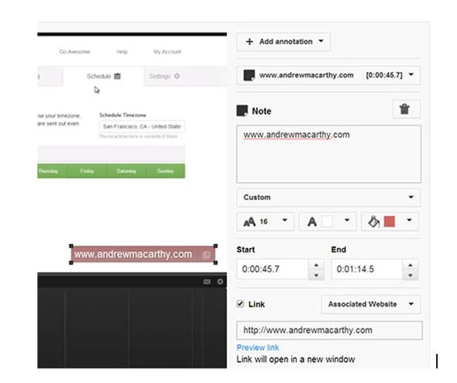If you add a watermark to your videos, one obvious use for this function is to place a transparent Associated Website Annotation right on top of it for the whole duration of your content. Alternatively, if the annotation is on show (as above), you can audibly direct viewers to click on it as a way to drive traffic to your website.