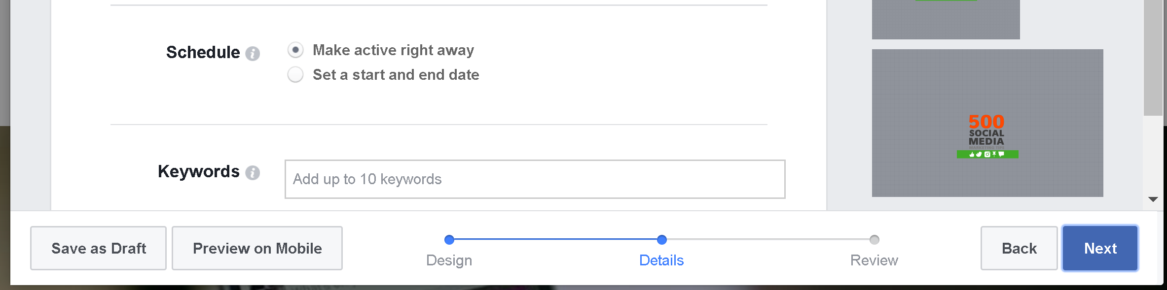 Next, tell Facebook if you want your frame to be available as soon as it is approved, or if you'd rather delay the start date. Last, add up to 10 keywords to help people find your Frame in future: