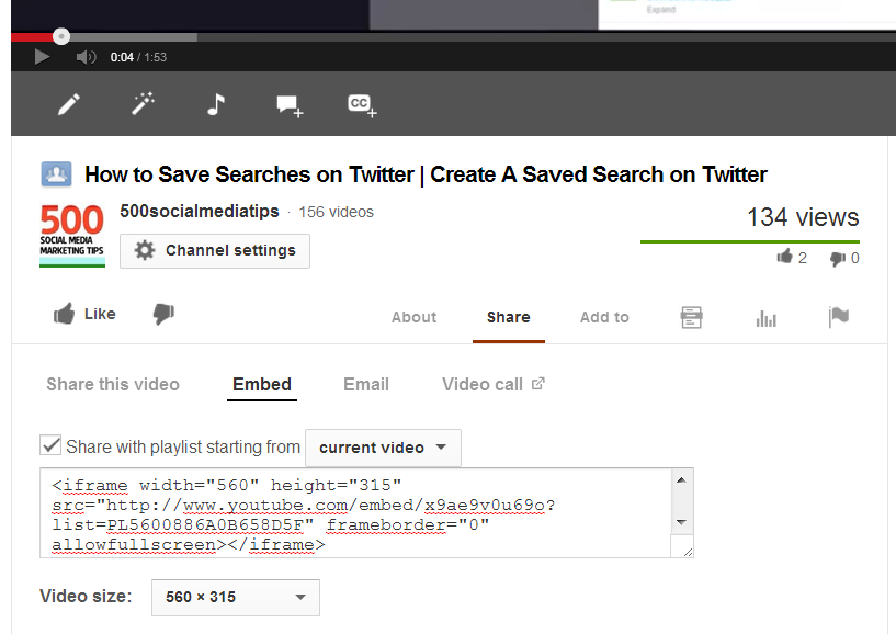 2. On the video page itself, select the "Share" and then "Embed" tab beneath the player. Use the drop-down menus to choose whether you want to begin the playlist from the current video or from the beginning, and at what size you want the video player to appear on your website.