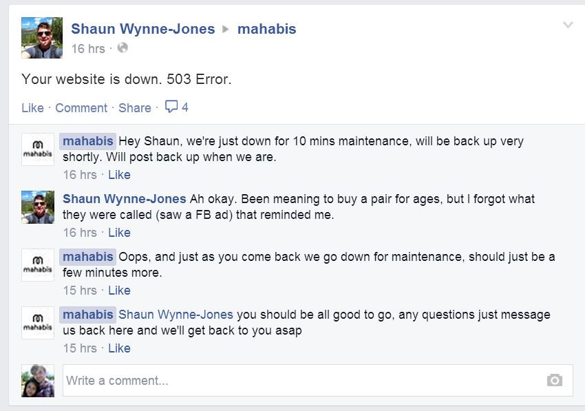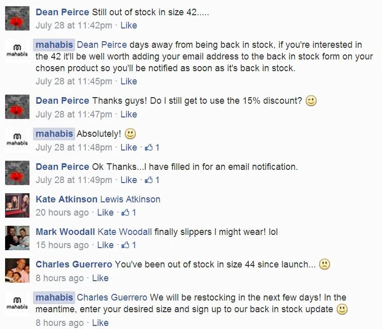 Just as social media gives you access to your customers 24 hours a day, so many of them expect to be able to reach you at all times, too (within reason!). In this respect, Mahabis does well to respond to customers' questions in a friendly, helpful manner and - perhaps more importantly - really rather quickly. In the examples below, responses to customer queries arrived in just minutes.
