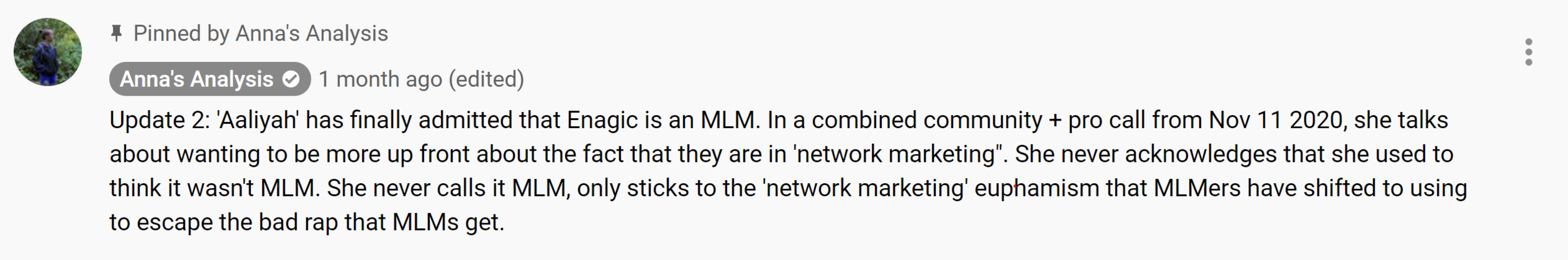 Here, Anna’s Analysis pins her own comment to give an update to the content of her video about an MLM scheme. Pinning the comment in this ways means that any clarifications or updates that need to be addressed will be seen in a prominent position.