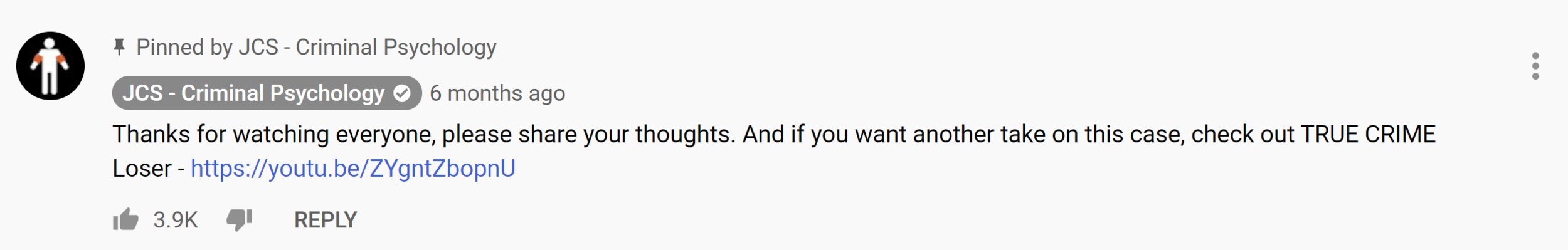 Another example of using your own pinned comment for promotion here. JCS - Criminal Psychology uses the top comment as a way to encourage discussion in the comments section (great for generating engagement, which the YouTube algorithm loves), and to promote another video.
