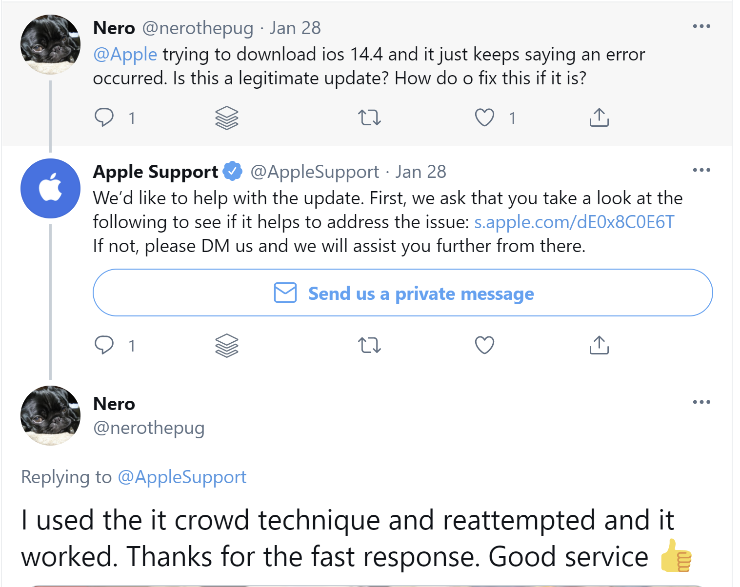 In the example below, Apple’s fast response time is appreciated by a customer on Twitter: