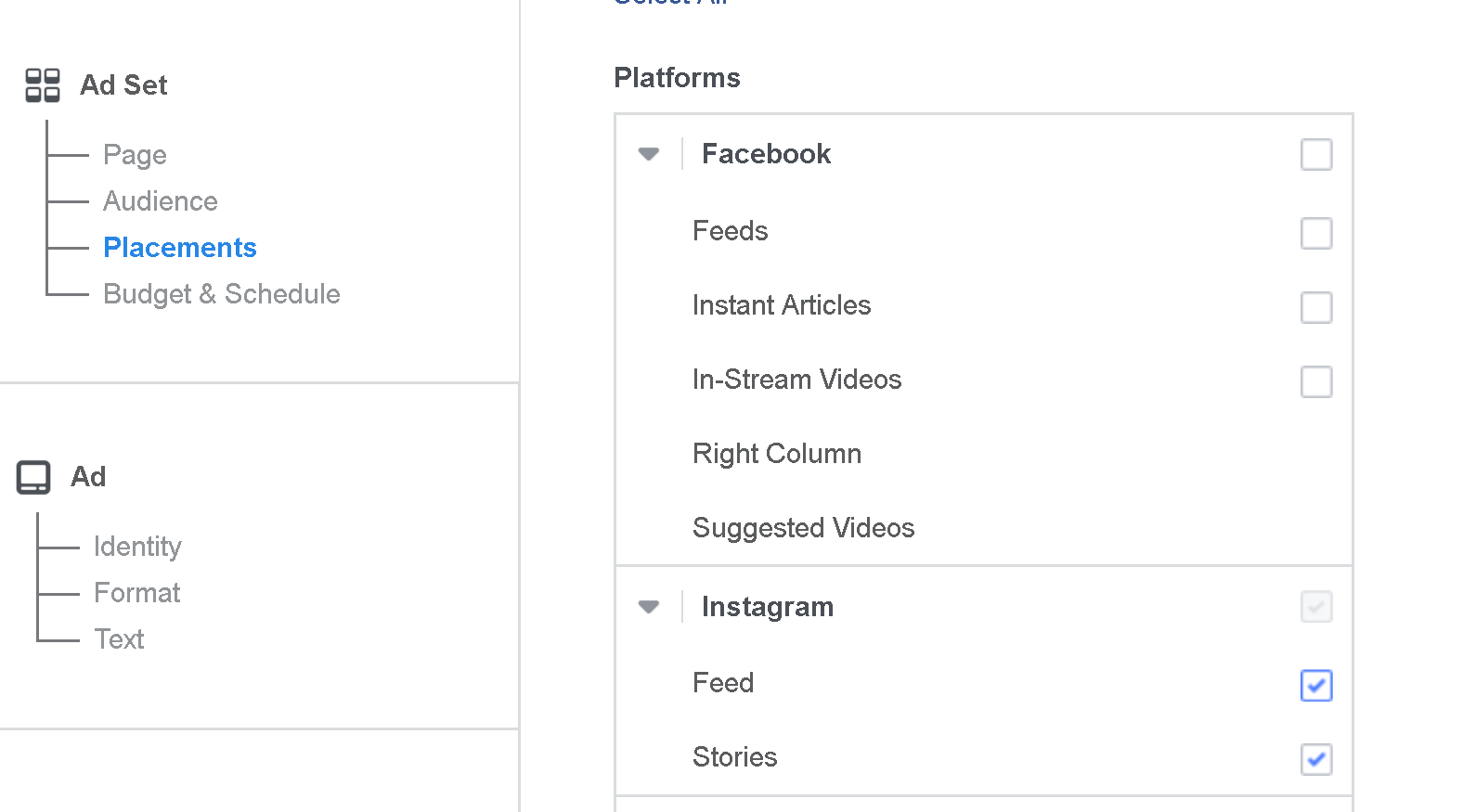 At the ad set level, choose the audience for your ad as normal. Then, select the Edit Placements option. Expand the Instagram placement selector and select Instagram Stories.