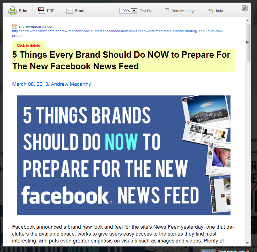 Once PrintFriendly has grabbed your blog post, hover over the different paragraphs of text and any images, and they will highlight yellow with a "Click to delete" message. Remove any unnecessary elements that will clog up your eventual Slideshare presentation. In my case, I remove the blog title at the top (reason for this coming up) and blurb about me from the bottom of the post. When you're done, click the "PDF" button.