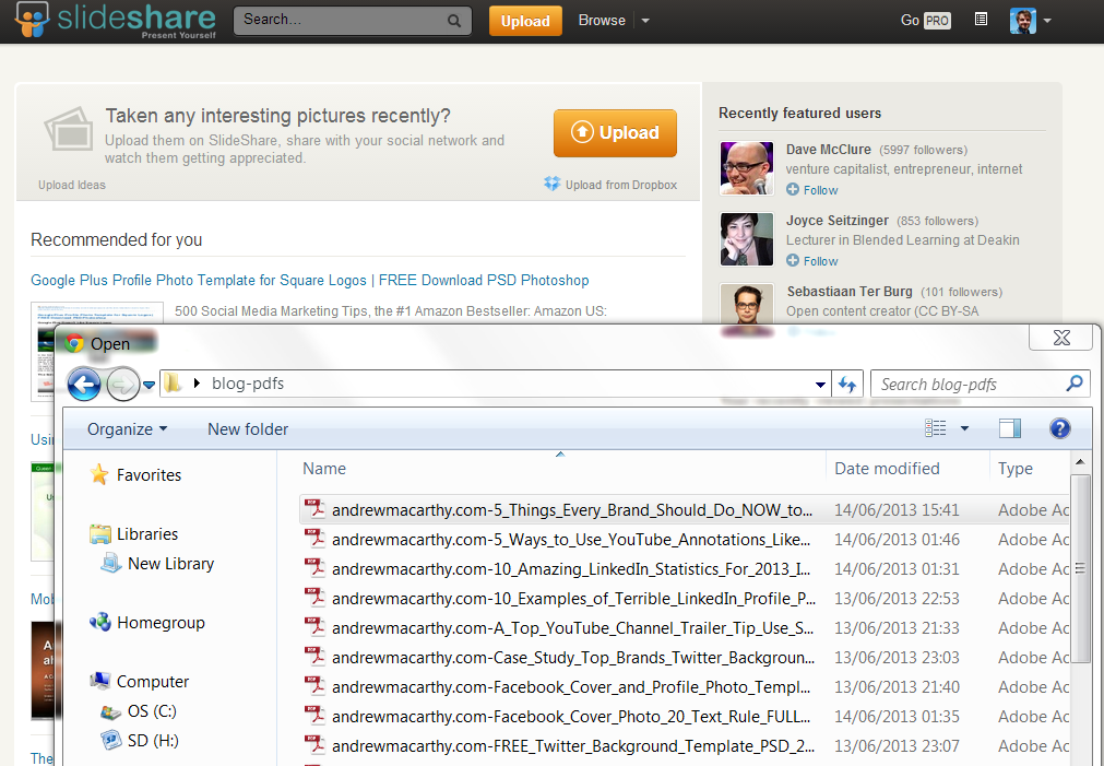 One of the coolest functions of Slideshare is that, if you upload a PDF document to your account, it will automatically convert the file into a presentation that can be read, shared, and embedded elsewhere by anyone on the site. A good way to utilise this feature is to convert your blog posts into PDF files and then upload them to Slideshare for extra exposure. The process is really easy and only takes a couple of minutes to complete. Here's how: