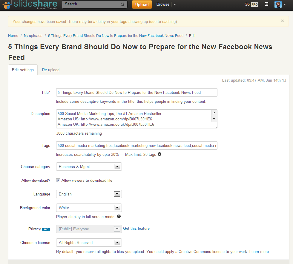 Visit your Slideshare uploads and click on the presentation you have just created to edit its settings, which by default won't be great at all. I simply copy and paste the title and tags from my blog post, and lift the "stock" description from my YouTube channel (which includes a call to action to buy my book, links to my social profiles, and a more blurb about the presentation) and paste it all in. Don't forget to choose the correct category, then save the changes.