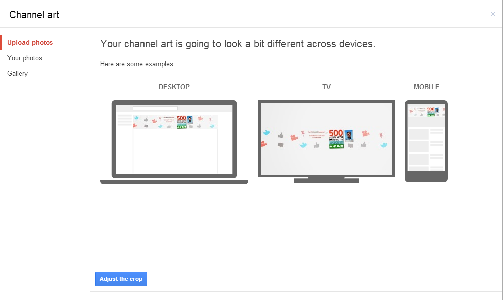 5. Upload your channel art to YouTube. Do not adjust the crop.