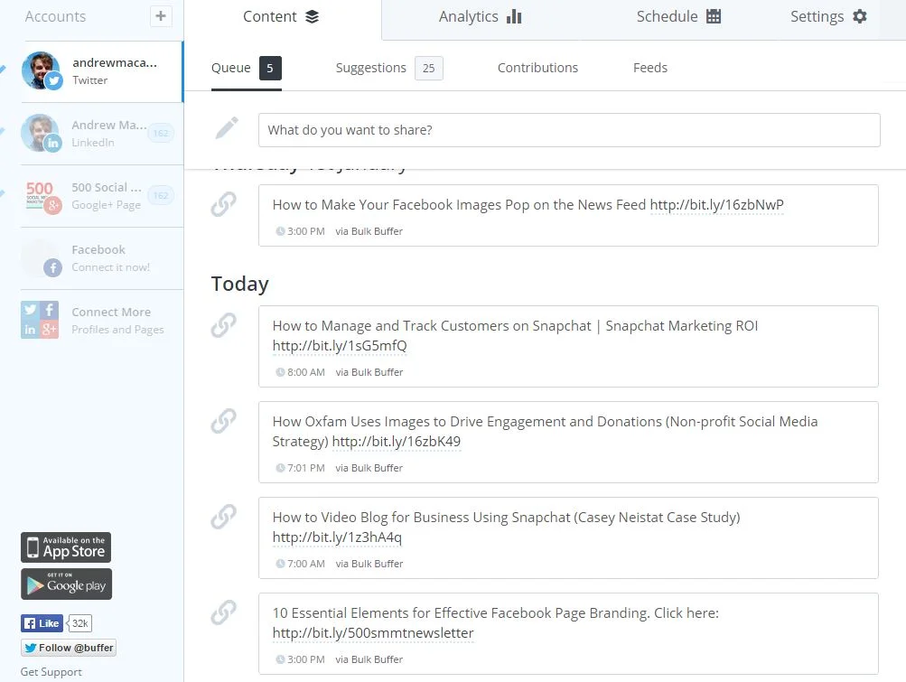 Scheduling social media content takes so much stress out of the role of social media managers, primarily because you don't need to be at the computer or on your phone to post every update. On its free plan, Buffer allows you to create and schedule posts to a single Facebook, Twitter, LinkedIn, and Google+ account, with a limit of 10 posts scheduled at a time.