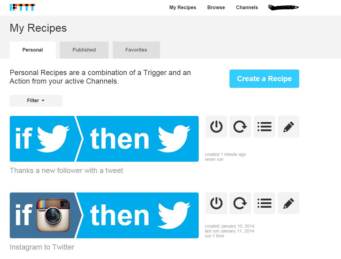 For example, a recipe might automatically post Instagram uploads to your "Instagram" Facebook album or tweet a "thank you" message to everyone who follows you on Twitter. Recipes are customisable from the "My Recipes" section to help you tailor them to your audience and requirements. There are thousands of recipes available to choose from, organised into channels to help you narrow down what you are looking for.