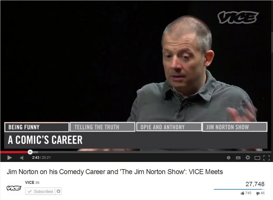 In the above example, VICE has uploaded a nearly half-hour interview with Jim Norton. As such conversations normally have natural sections, VICE uses annotations to allow viewers to skip instantly to the section which interests them most. The bar along the bottom with sction names was added in pre-production, with annotations added later.