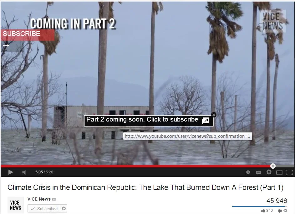 As mentioned above, VICE often splits long form content into several parts (this encourages people to stick around for new episodes and shorter videos are more easily digested). When this is the case, annotations are used to encourage people to subscribe to receive the next part in their subscription inbox, or (when the new part has been uploaded) to click through to watch it. In the third example above, I like the use of the unobtrusive arrow, used subtly to guide viewers back and forth through different parts.