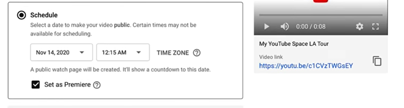 But if you set a video to premier at the time you normally upload, your viewers will benefit from a visual reminder that your new video is coming, and when it will launch.