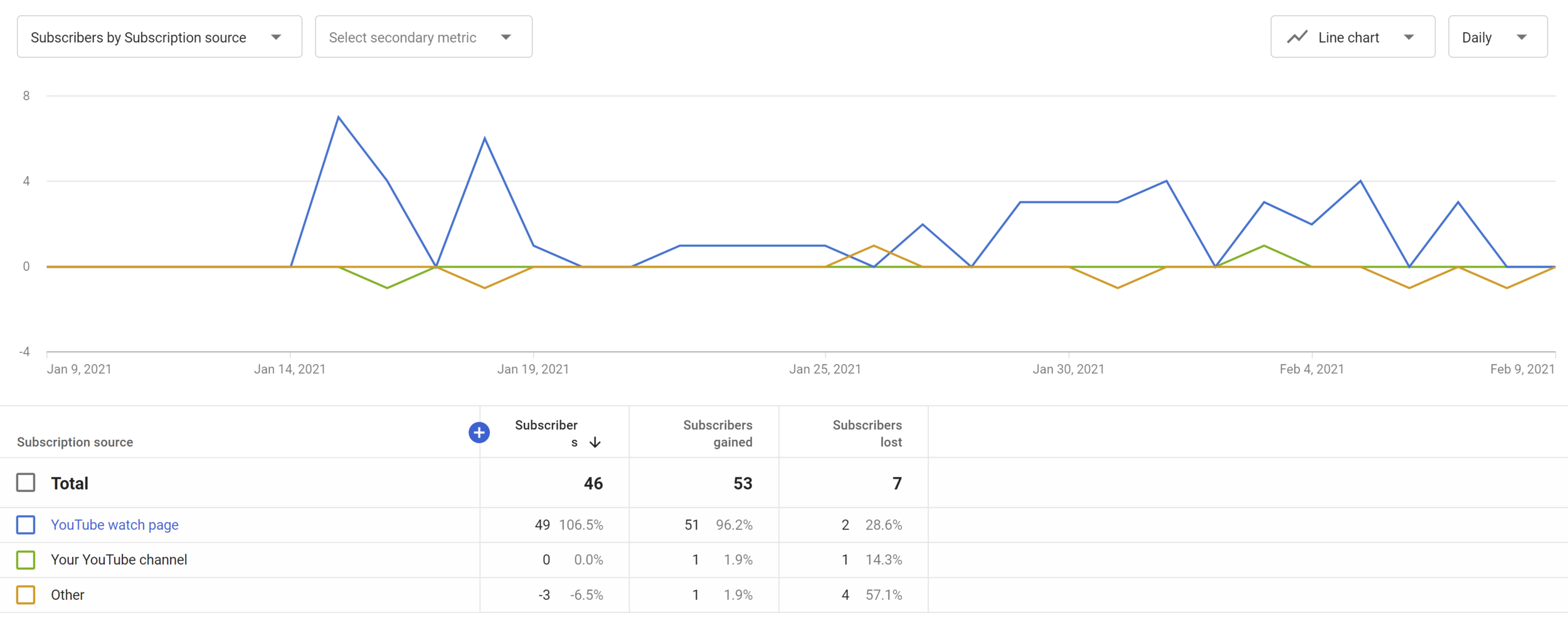 Over 30 days, I gained 53 subscribers and lost 7, giving a final total of 46 - over one per day, not too shabby. All but one of the subscribers was gained on the watch page of a video, with one subscribing from my channel page.