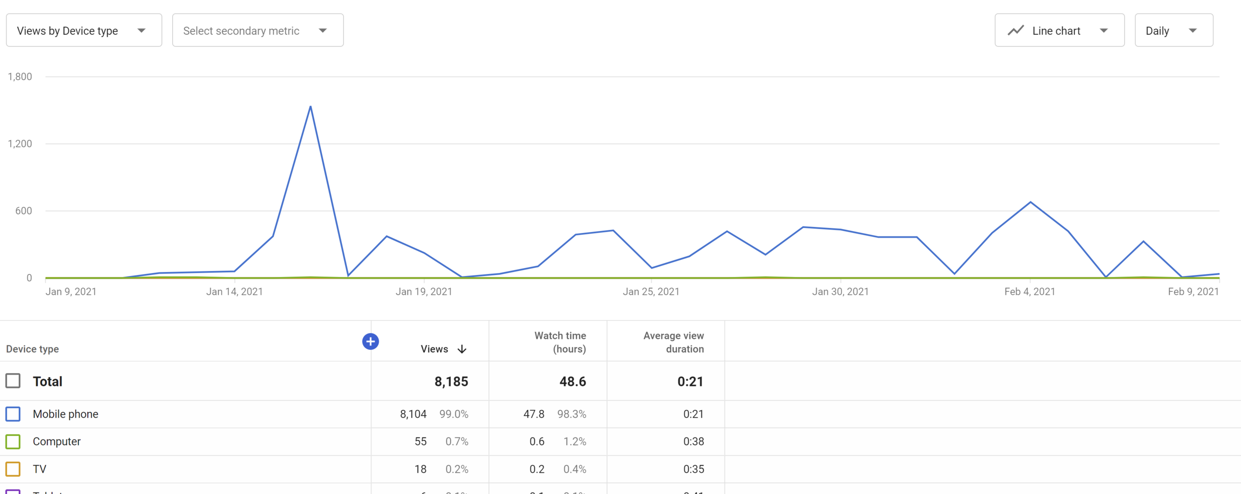 It appears that, for a whole host of reasons (recency, length, SEO, popularity, etc.), the YouTube algorithm wasn’t giving them much visibility to desktop users of the site - 99% of my views were on mobile devices.