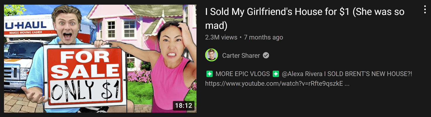 Here, we see the anger in Carter Sharer’s girlfriend’s expression. The thumbnail catches the eye, and the title works to explain why she’s so mad.