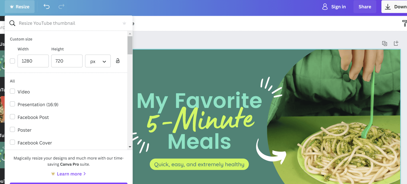 These measurements are important if you’re creating custom thumbnails in software like Photoshop, but Canva’s YouTube thumbnail template will give you the ideal size for YouTube thumbnail design one click.