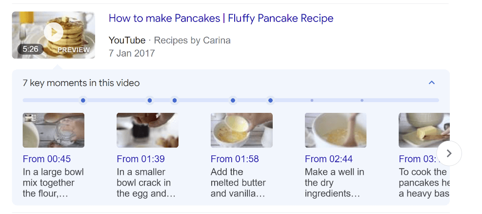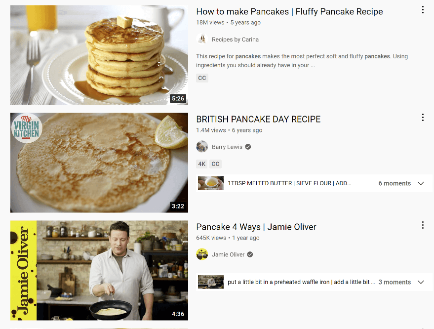 Check out the above example for a YouTube search for “how to make pancakes”. The top two results were uploaded a year apart (the top result one year later than the second, in fact). But look at the difference in view count!