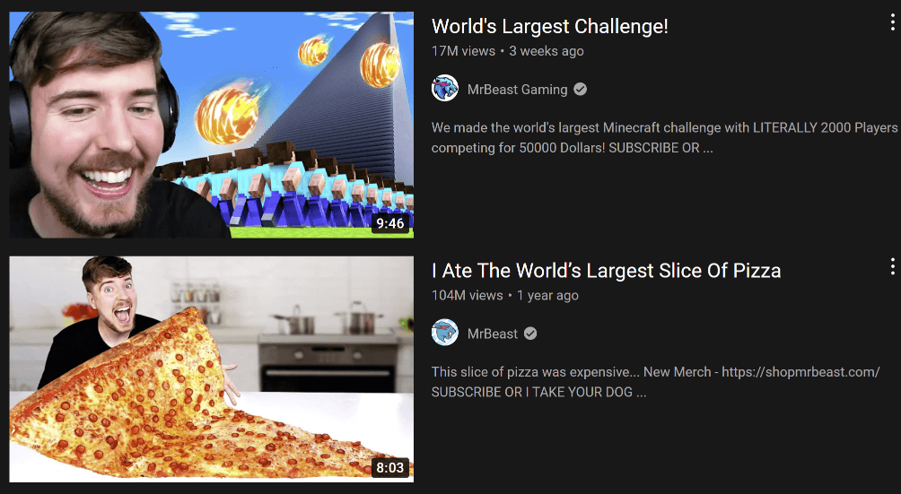 Consider the two examples from Mr Beast above, in which a zoomed-in face and mid-range shot are used to brilliant effect.