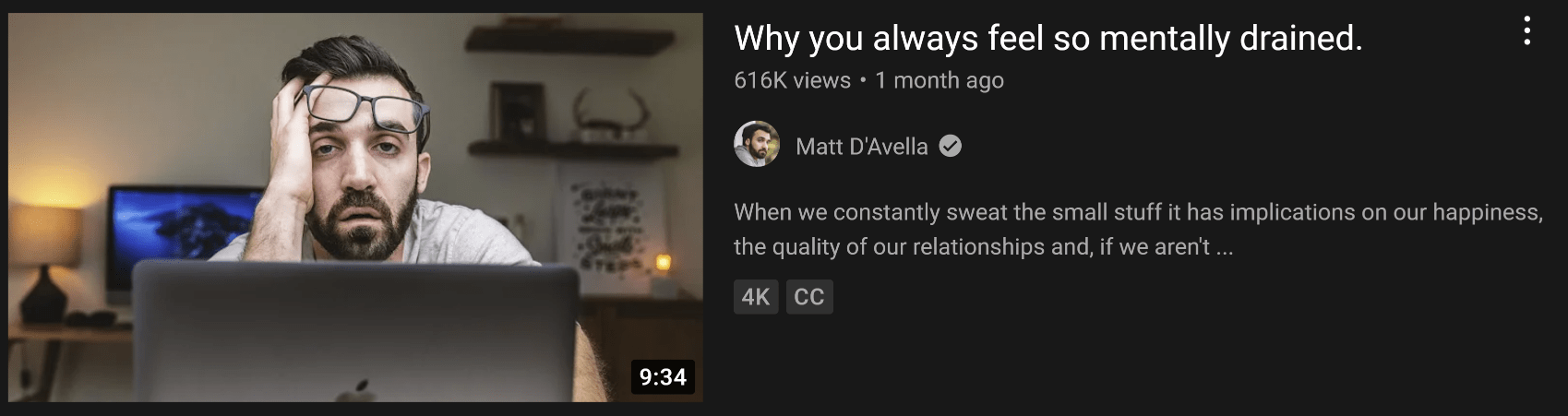 Here’s that juxtaposition between an emotion and a still from the video, with a red arrow to draw your attention to it for good measure. Here, worry is the expression used to help draw viewers into clicking.