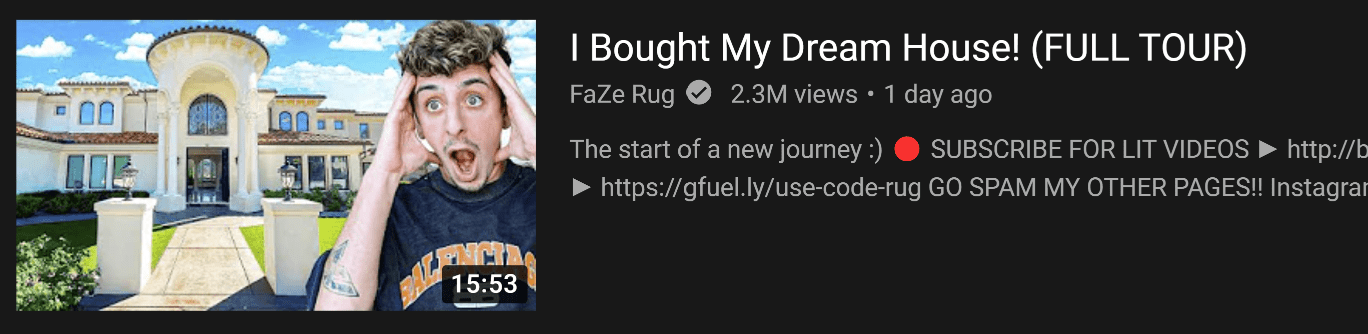 Faze Rug’s reaction to his new house purchase is obviously over the top, but as a thumbnail showing shock and surprise, it works to be super clickable.
