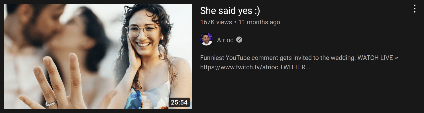 Here, Atrioc focuses on the happiness of a marriage proposal in his thumbnail. Notice the contrast between the foreground and background - the latter blurred as a teaser for what the video includes.