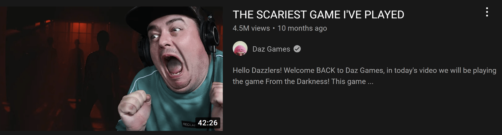 Here, we get a juxtaposition between a frightening game and Daz Games’ exaggerated reaction. Is he that scared of the game? Unlikely, but the degree of fear he shows in the thumbnail makes it clickable.