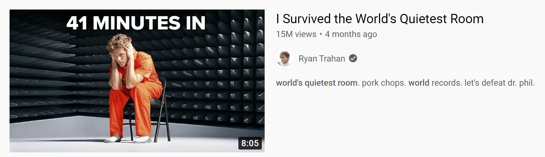 We know that the "quietest room in the world" that Ryan Trahan endures isn't going to look anywhere near as dramatic as in the thumbnail. And his pained expression isn’t likely something he is going to show for the entire time.