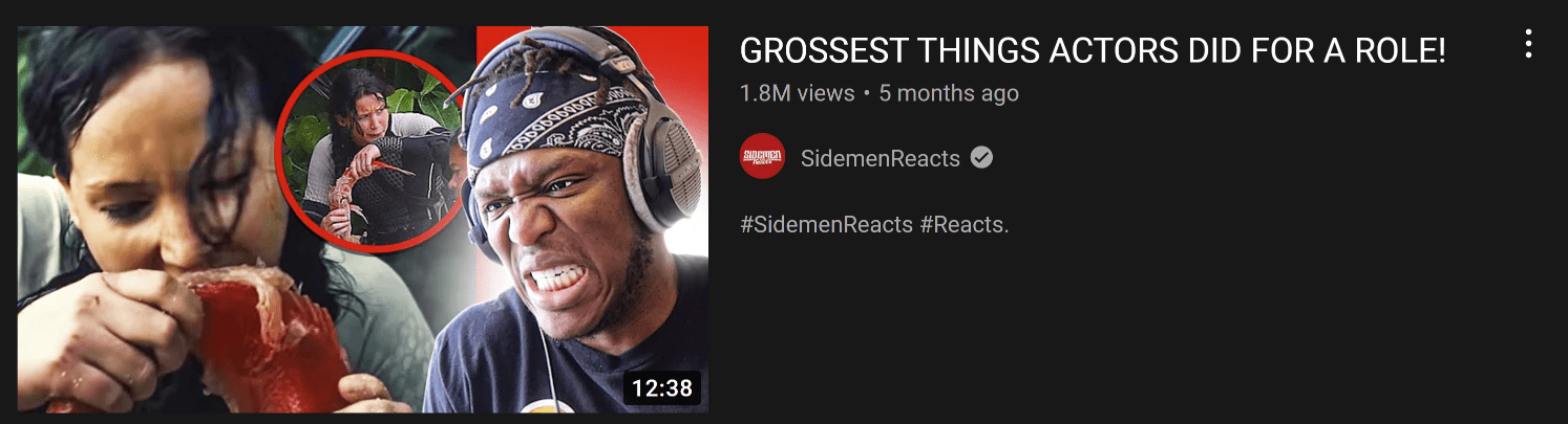 Here’s the SidemenReacts channel uses disgust as an extreme emotion to stop people scrolling and encourage them to click and watch. Notice the contrast added to KSI’s face to further exaggerate the emotion.