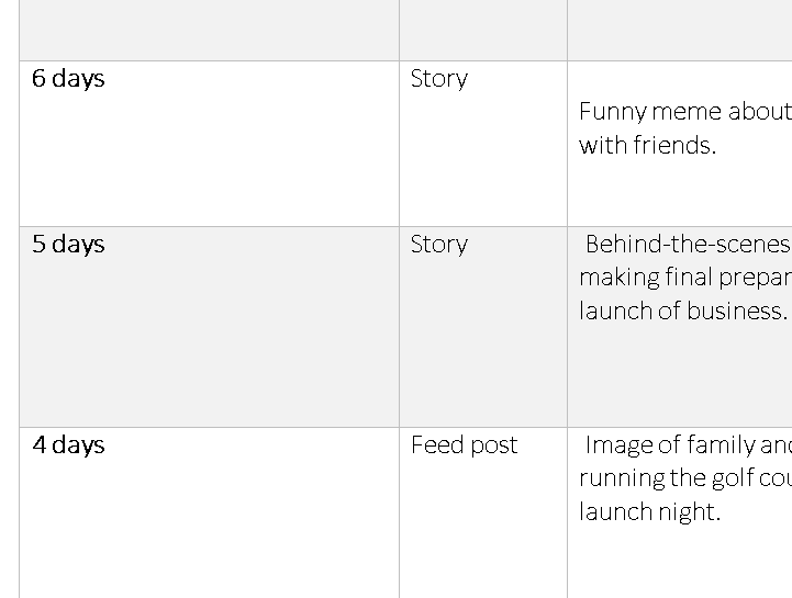 The best social media strategy is born out of strategic content planning. Whether its a product launch, an event, a sale, etc., this template will allow you to lay out complete post ideas for 7 days in the lead-up. Includes a full example to get you started!